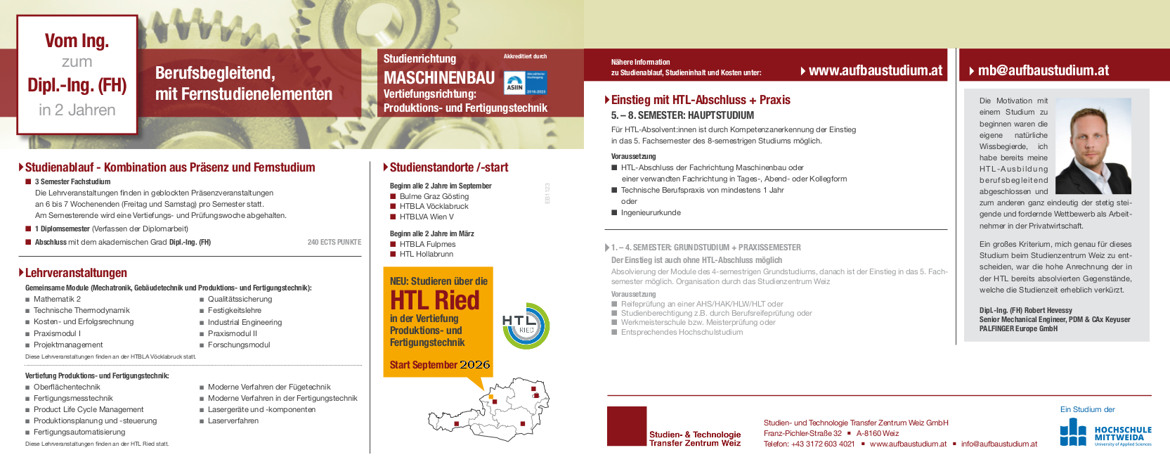 weitere InformationenZielgruppe: Absolvent:innen einer HTL oder Abend-HTL bzw. eines Kollegs mit Schwerpunkt Maschinenbau oder Elektrotechnik.